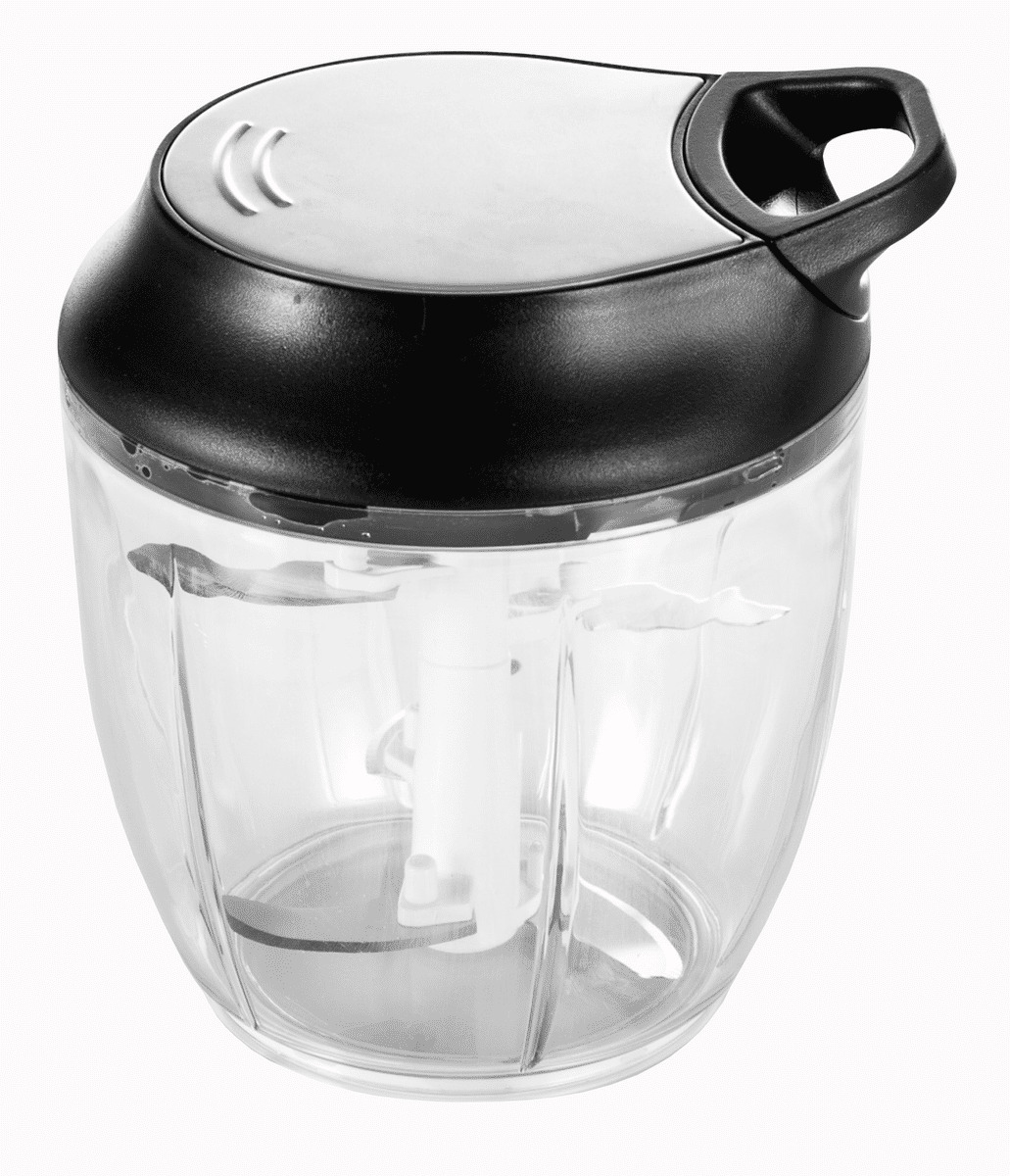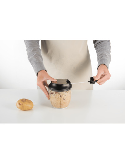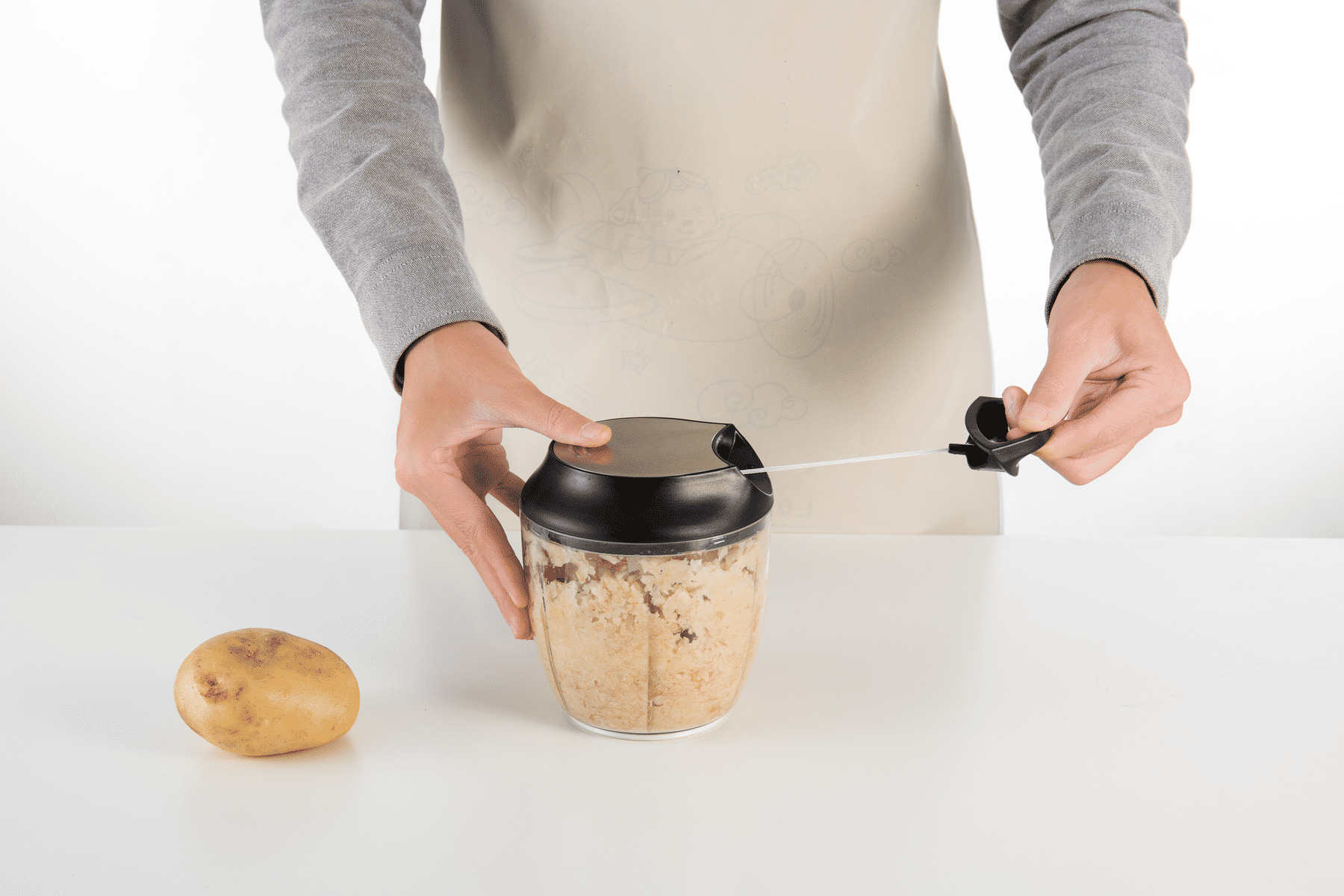 Comment fonctionne ce mini hachoir manuel ? Il suffit de tirer sur la cordelette pour actionner les lames rotatives et hacher rapidement vos ingrédients.