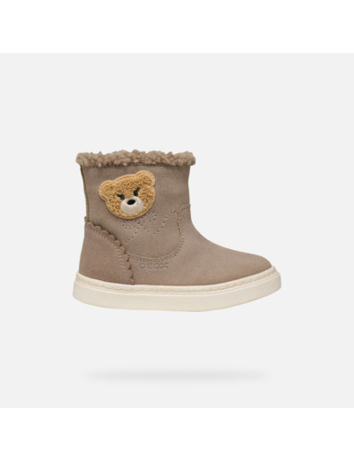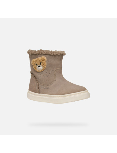 Conçues en cuir velours beige foncé, ces bottines se distinguent par une application en forme d’ourson qui apporte une touche tendre et unique. La fausse fourrure intérieure assure chaleur et douceur, tandis que la silhouette épurée s’adapte parfaitement aux tenues décontractées de votre enfant, pour un style à la fois romantique et moderne.