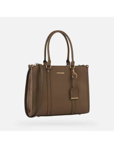 Dimensions : 36 cm de longueur, 12 cm de largeur, 30 cm de hauteur. Composition 100% synthétique à effet cuir saffiano. Fermeture éclair en métal, accessoires métalliques finition or. Bandoulière réglable et amovible. Deux poches intérieures, dont une avec fermeture éclair. Plaquette métallique discrète signée Geox.