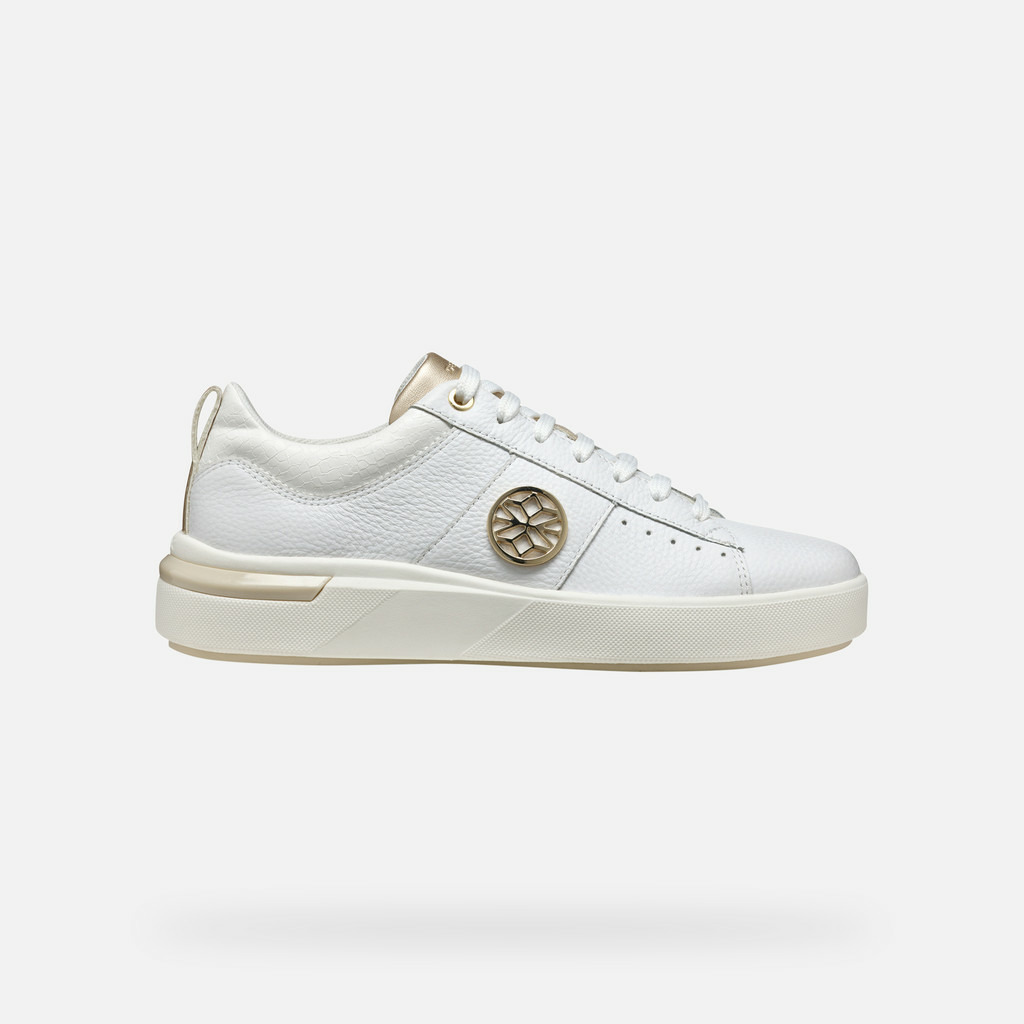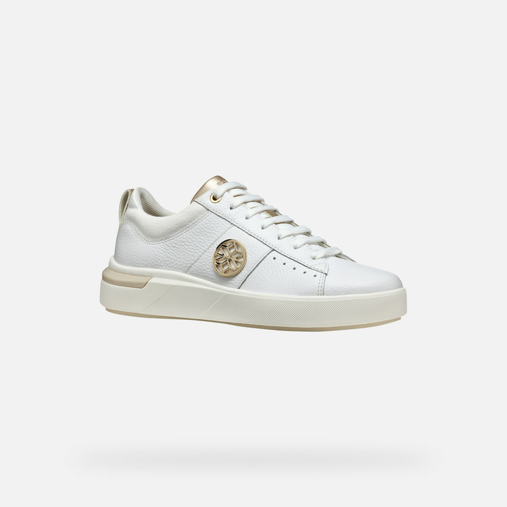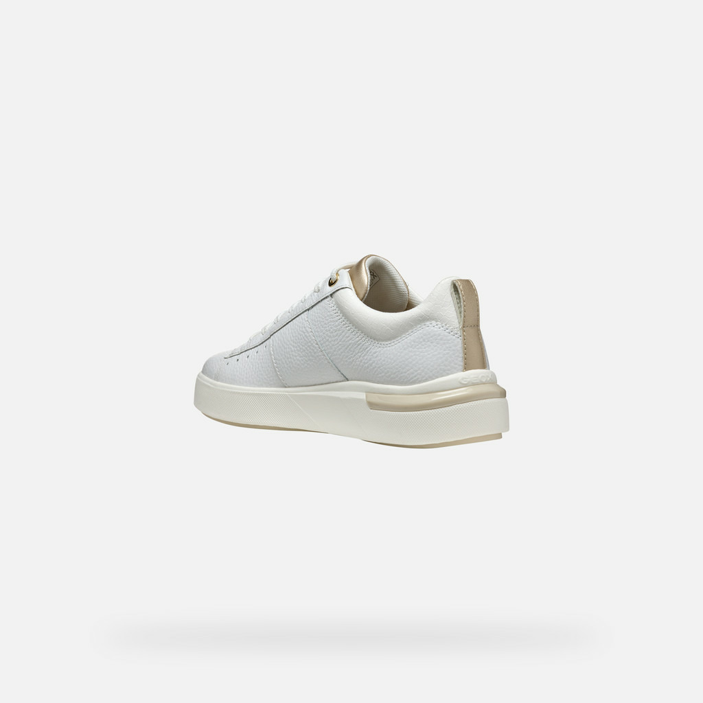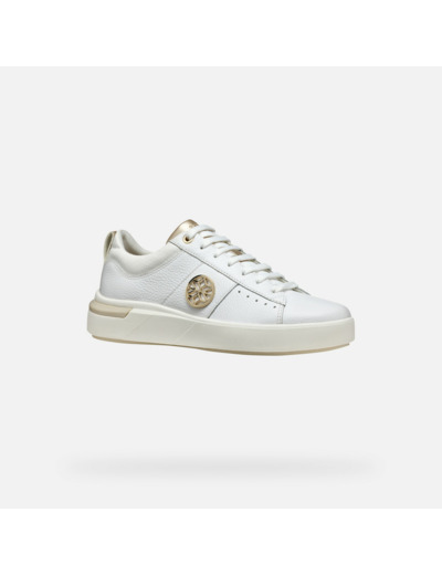Composition : 75 % cuir foulonné, 25 % synthétique pour la tige ; 80 % tissu, 20 % synthétique pour la doublure. Couleur : blanc avec imprimé effet python. Catégorie : sneakers femme, marque Geox.