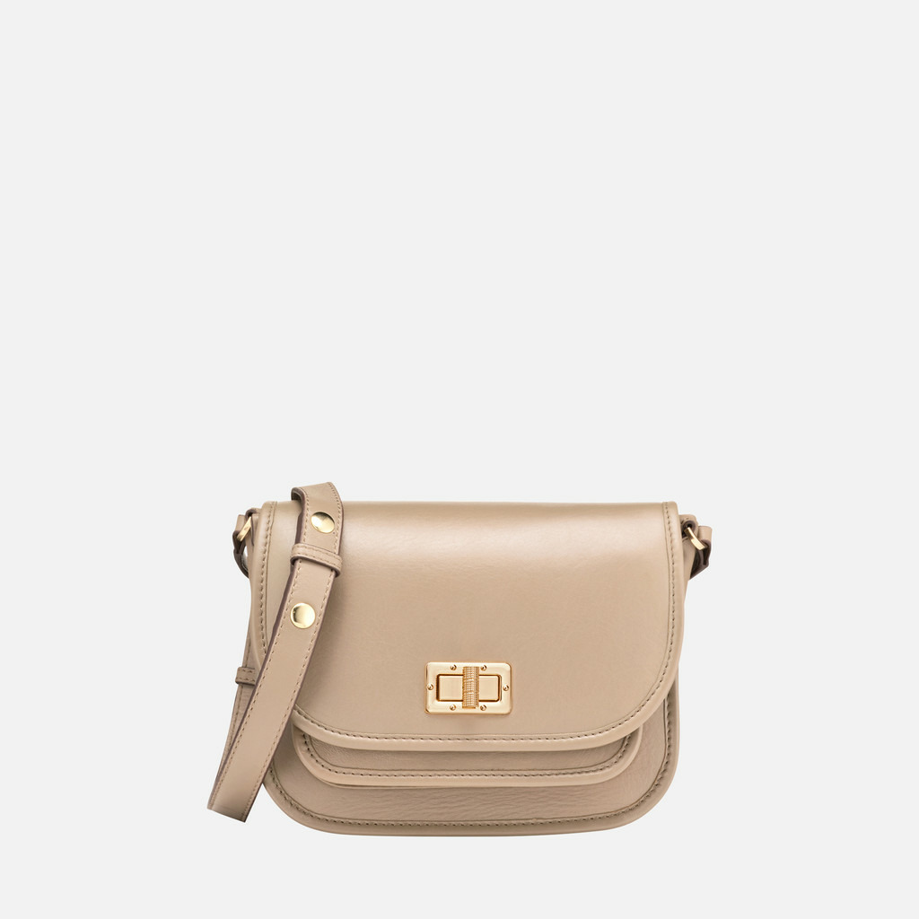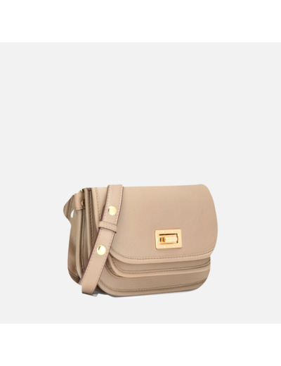 100% cuir lisse, finition taupe, sac à soufflet avec bandoulière réglable, fermeture par fermoir tourniquet. Dimensions adaptées pour contenir vos indispensables tout en restant compact.