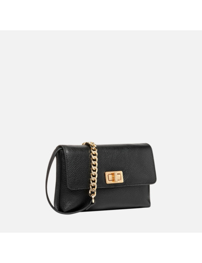 Dimensions compactes : 23 cm de long, 15 cm de haut, 5 cm de large. Composition 100 % cuir. Bandoulière en cuir et chaîne métallique légère, réglable et amovible. Fermeture par patte et fermoir moleté. Intérieur avec poche à fermeture éclair.