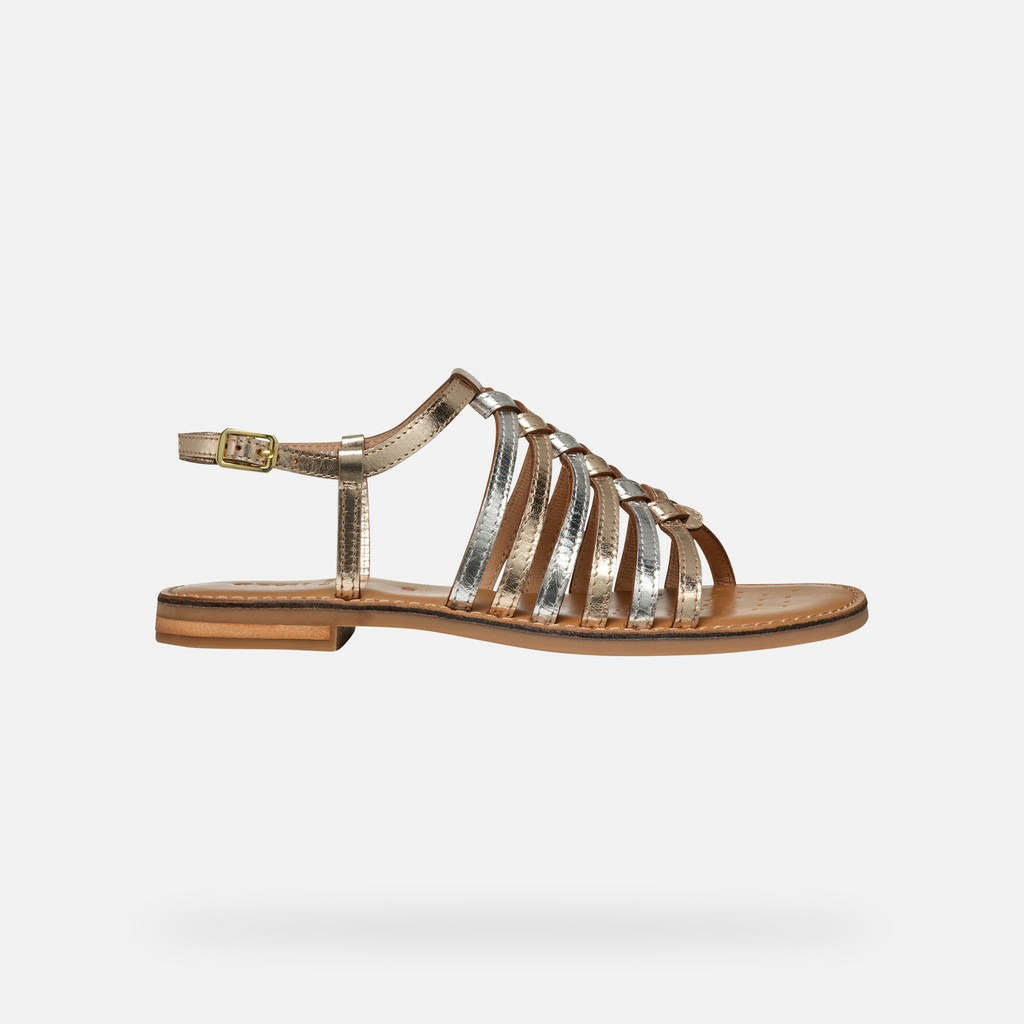 D MADDALUSIA C incarne l’élégance légère et la modernité urbaine. Ces sandales plates subliment vos tenues estivales avec un éclat subtil mêlant or clair et argent.