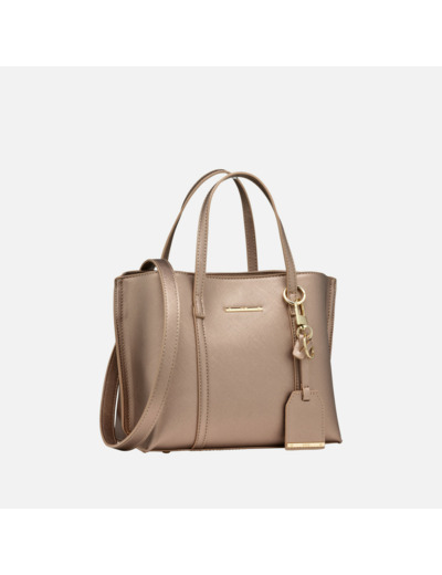 Dimensions : 27 cm de longueur, 15 cm de largeur, 18,5 cm de hauteur. Composition : 100 % matériau synthétique à effet cuir saffiano. Fermeture par bouton magnétique. Anse double et bandoulière réglable et amovible. Deux poches intérieures. Porte-clés amovible avec plaquette en cuir.