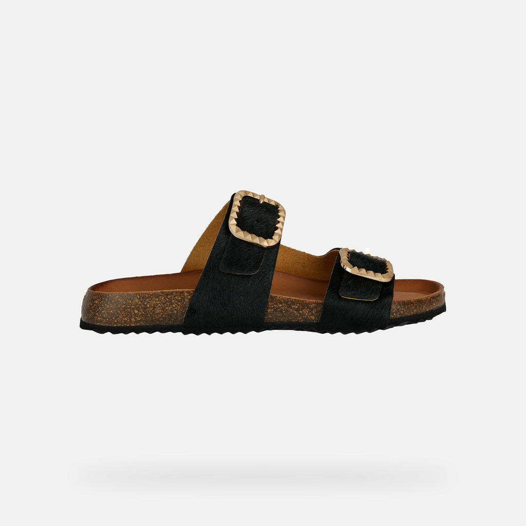 Fabriquées en cuir à effet poulain et synthétique, ces sandales présentent une semelle anatomique respirante. Les deux boucles ajustables permettent un maintien personnalisé. Leur coloris noir polyvalent facilite l’association avec toutes vos tenues.