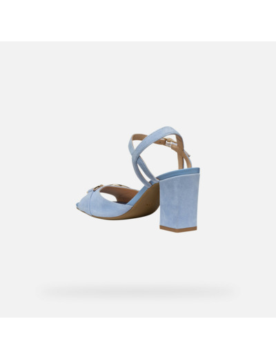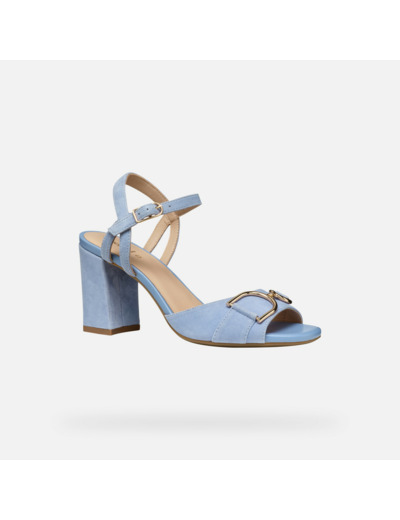 Fabriquées à 100 % en cuir, ces sandales présentent une tige en daim bleu clair et un talon haut stable. Le design intègre un détail métallique subtil qui rehausse leur allure, tandis que la semelle respirante assure un confort prolongé.