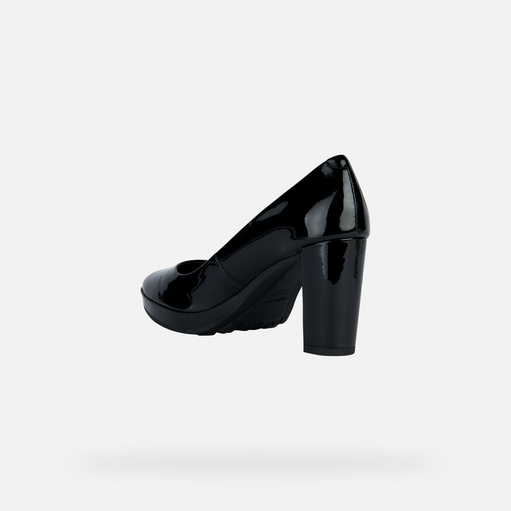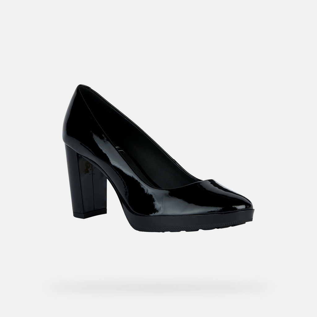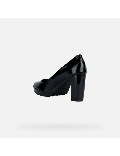 Tige en cuir verni noir 100% cuir, doublure en cuir et synthétique (75% cuir, 25% synthétique), semelle intérieure amortissante, talon haut et fin, légèreté et respirabilité optimisées par la technologie Geox.