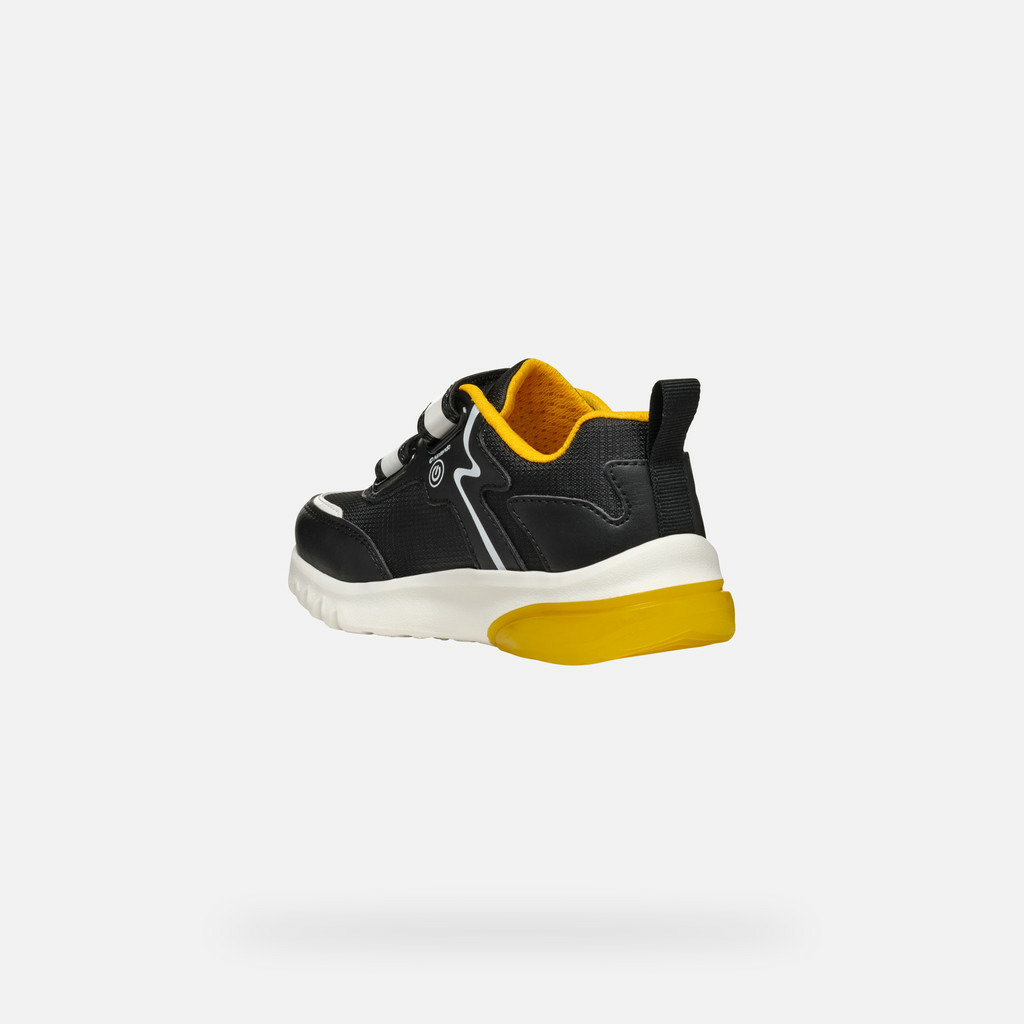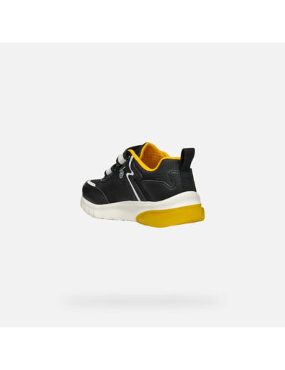 Ces sneakers basses signées Geox, fruit d’une collaboration exclusive avec Nintendo, captivent par leur design audacieux mêlant noir et jaune. La tige, en matière effet cuir et nylon, est décorée d’applications inspirées du héros emblématique Super Mario, pour un look unique et dynamique. Les lumières intégrées dans la semelle extérieure insufflent une touche d’originalité et de fun à chaque mouvement, parfaites pour accompagner les journées actives de votre enfant.