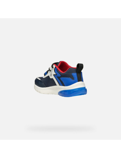 Composition : 68% synthétique, 32% tissu pour la tige, 100% tissu pour la doublure. Sneakers basses avec semelle extérieure lumineuse, mélange de matières effet cuir et nylon, collaboration Geox x Nintendo, coloris bleu marine et bleu roi.