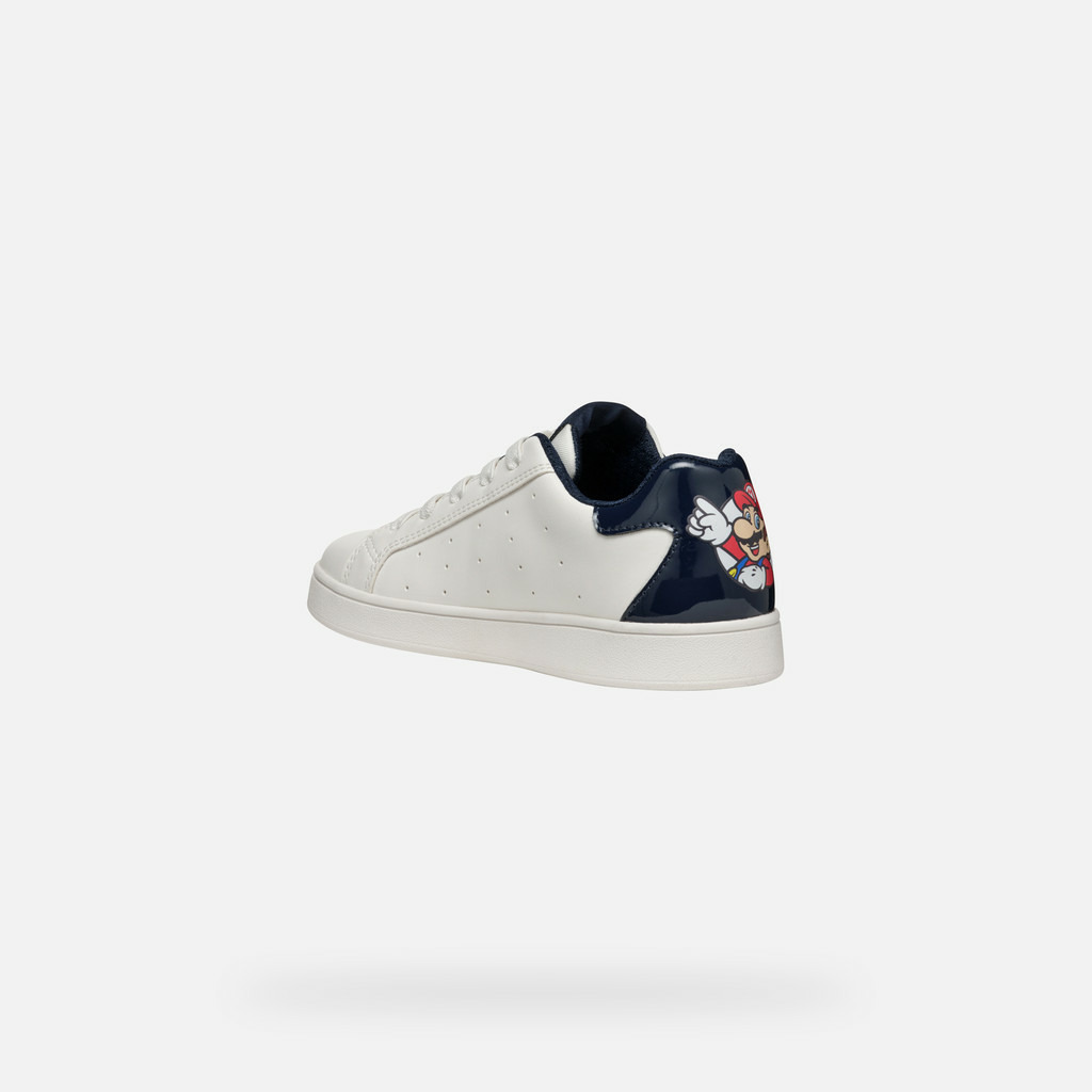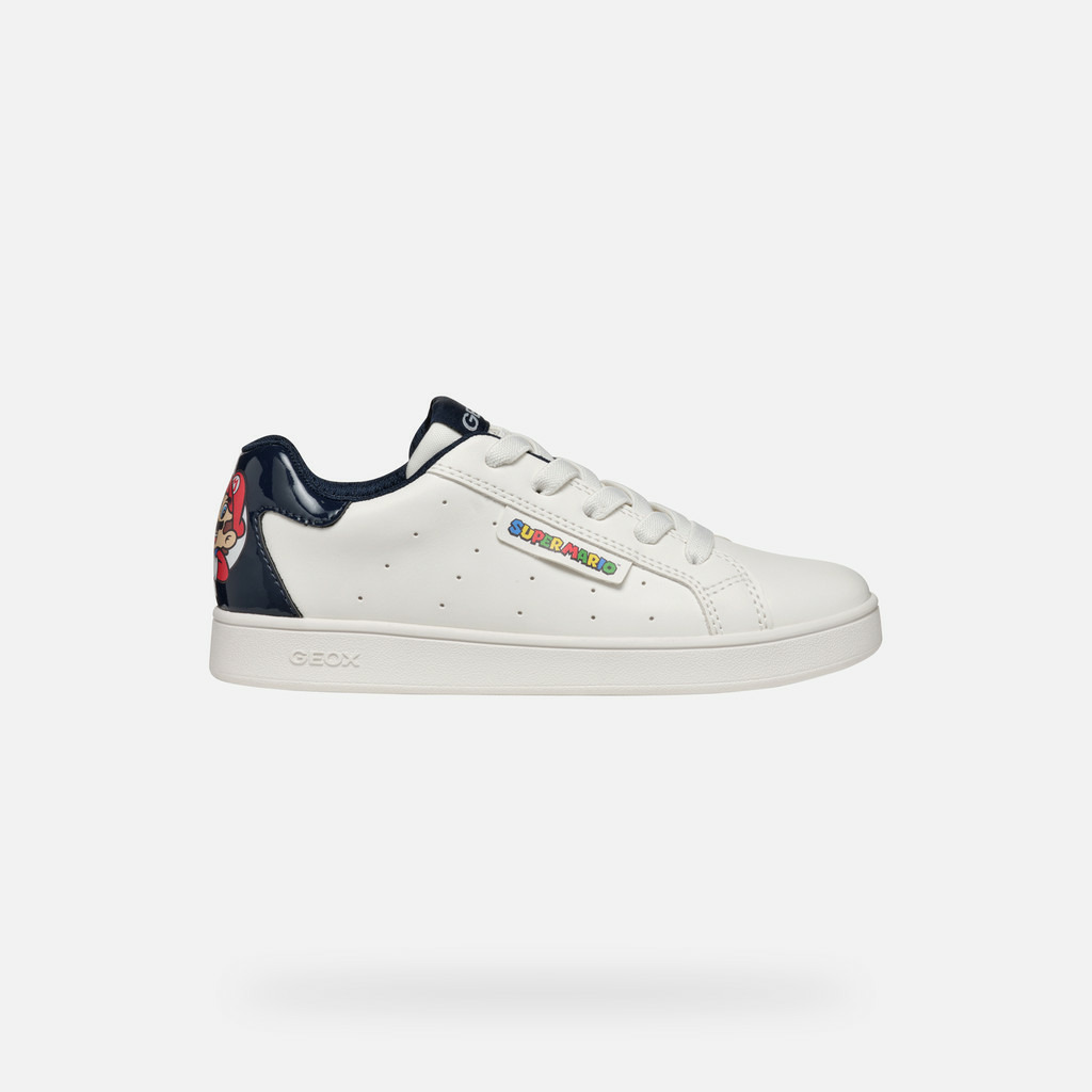 Conçues pour les garçons actifs, ces sneakers basses affichent un design épuré en blanc classique rehaussé de détails bleu marine. Le talon arbore un imprimé Super Mario, symbole d’une énergie joyeuse et d’un esprit décontracté. La matière à effet cuir confère une allure moderne tout en assurant un confort durable au quotidien.