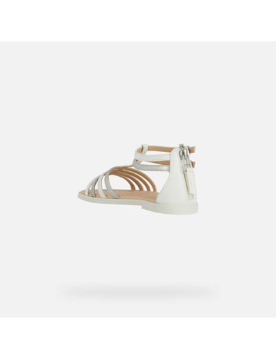 Ces sandales plates signées Geox marient habilement matières à effet cuir et nubuck nacré, créant un look raffiné et contemporain. Le blanc éclatant associé à l’argent clair apporte une fraîcheur lumineuse, idéale pour accompagner les aventures de votre enfant avec une note féminine et tendance. Faciles à enfiler grâce à leur fermeture éclair au talon, elles s’ajustent parfaitement grâce aux brides réglables à la cheville.