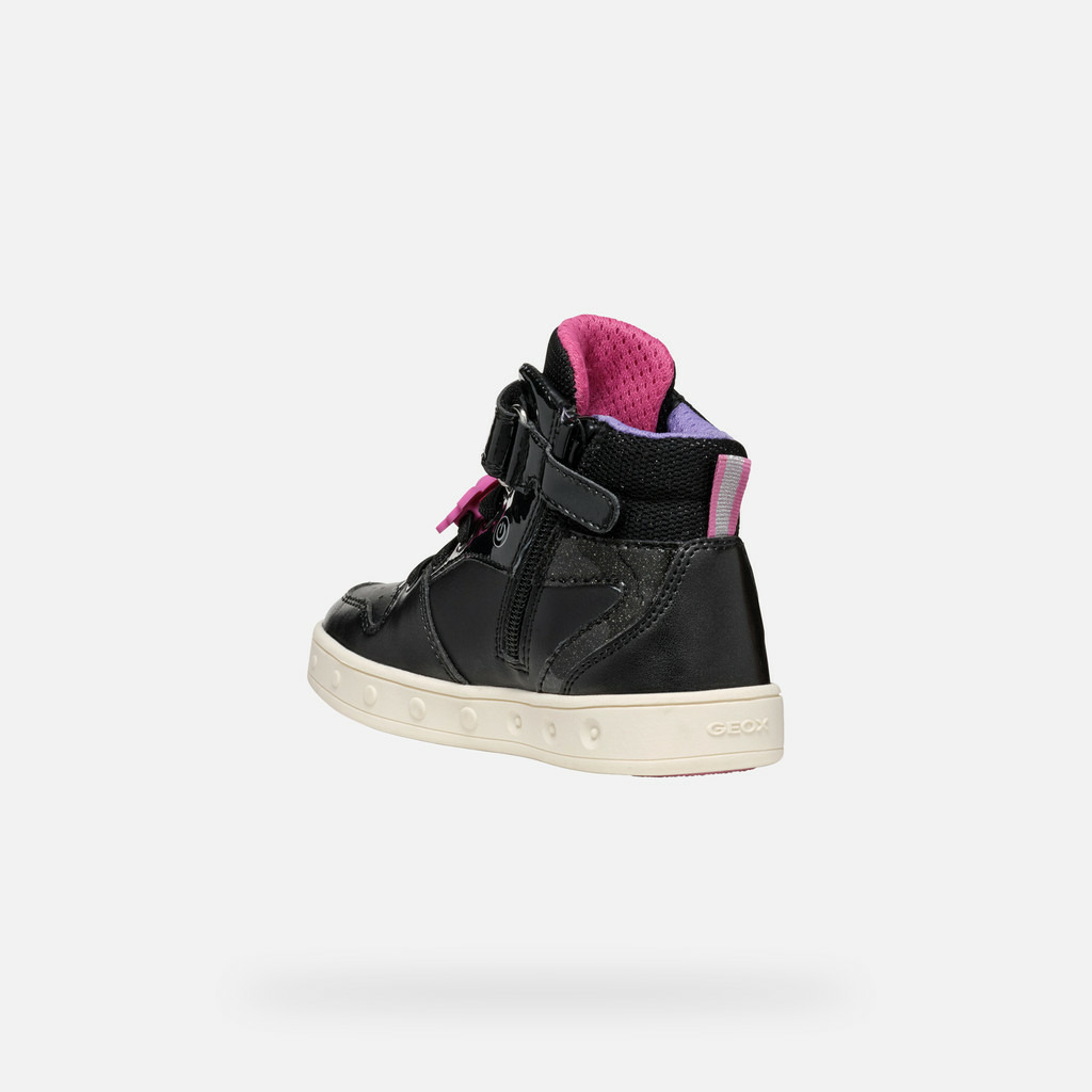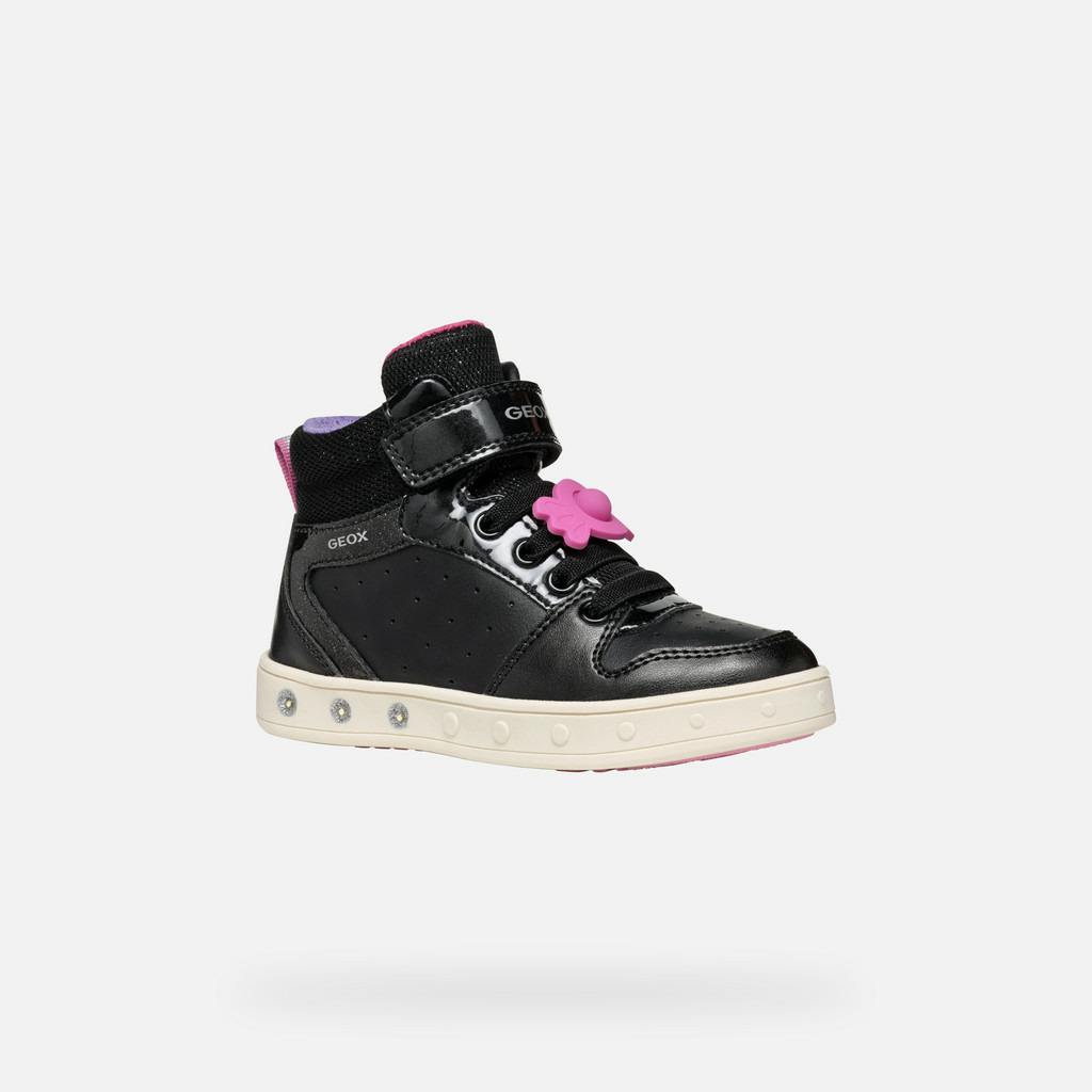 Ces sneakers semi-montantes signées Geox captivent par leur design moderne mêlant noir profond et fuchsia vibrant. La matière à effet cuir et cuir nacré apporte une allure sophistiquée tout en restant adaptée au quotidien actif des enfants. Les lumières intégrées dans la semelle extérieure transforment chaque mouvement en spectacle, stimulant la joie et l’énergie de votre enfant.