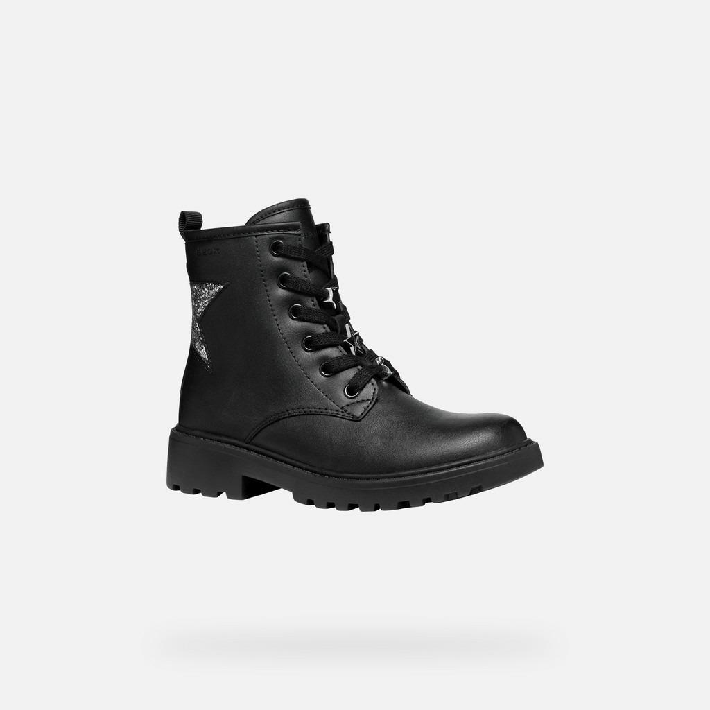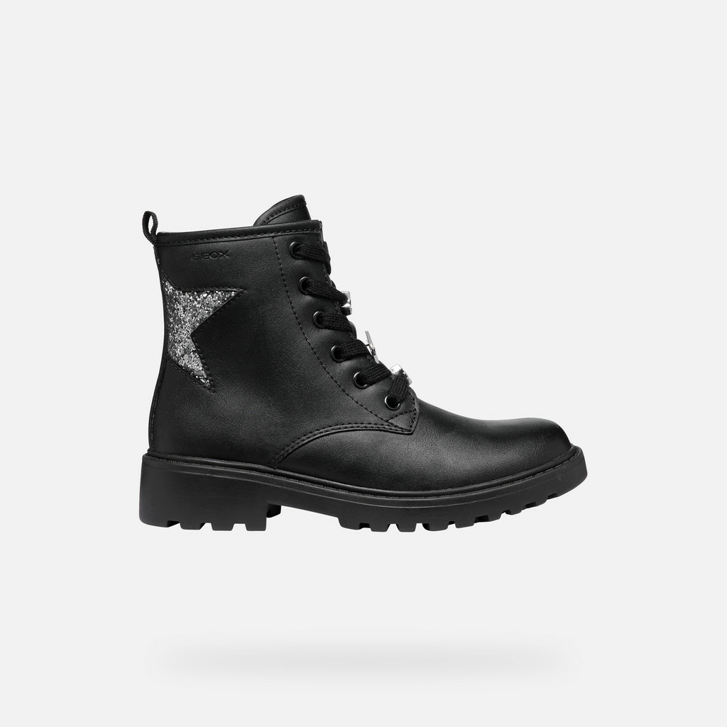 Composition : 85% synthétique et 15% tissu pour la tige, 80% tissu et 20% synthétique pour la doublure. Bottines à lacets, coloris noir avec détails argent foncé brillants et application étoile pailletée.