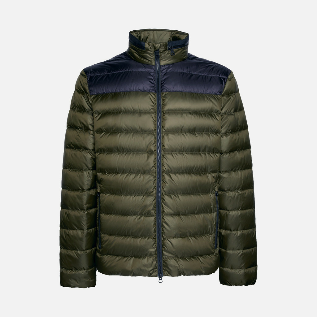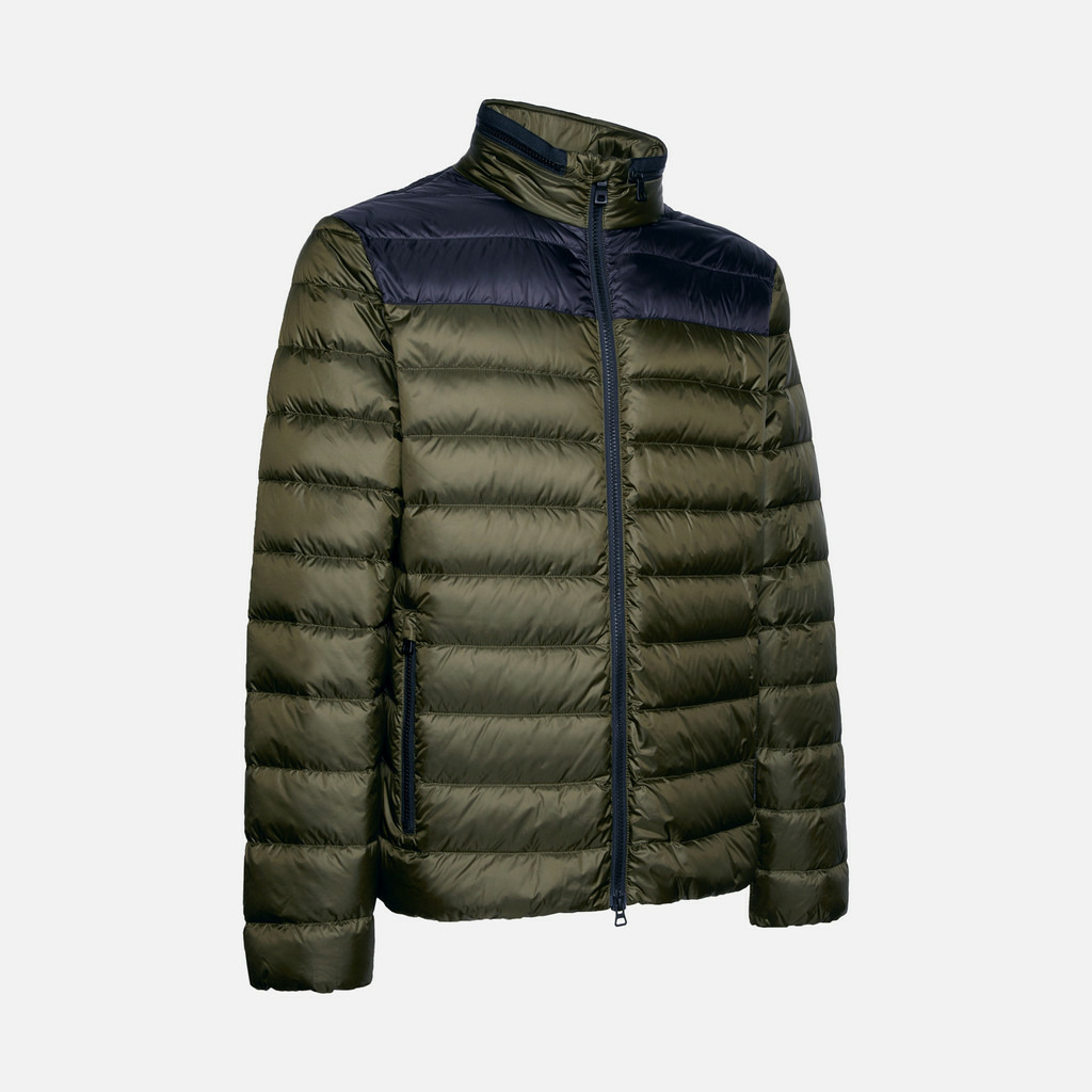 Composition : 100% nylon. Garnissage : 90% duvet de canard, 10% plumes de canard. Coupe courte, déperlante et coupe-vent. Design à blocs de couleur vert olive et noir. Modèle facilement repliable pour un transport simplifié.