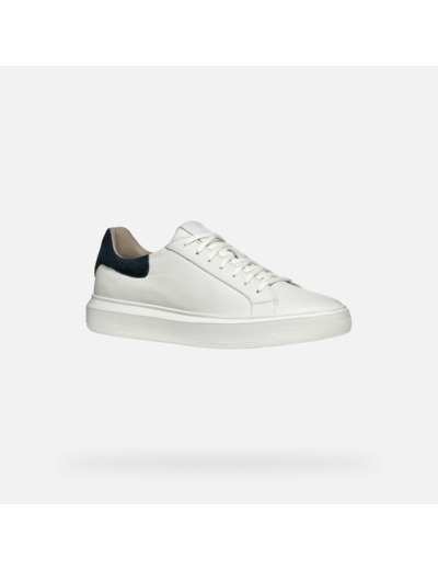 Extérieur : 86% cuir imprimé, 14% tissu. Intérieur : 90% tissu, 10% synthétique. Sneakers basses pour homme, respirantes et confortables, finition blanche avec col bleu marine.