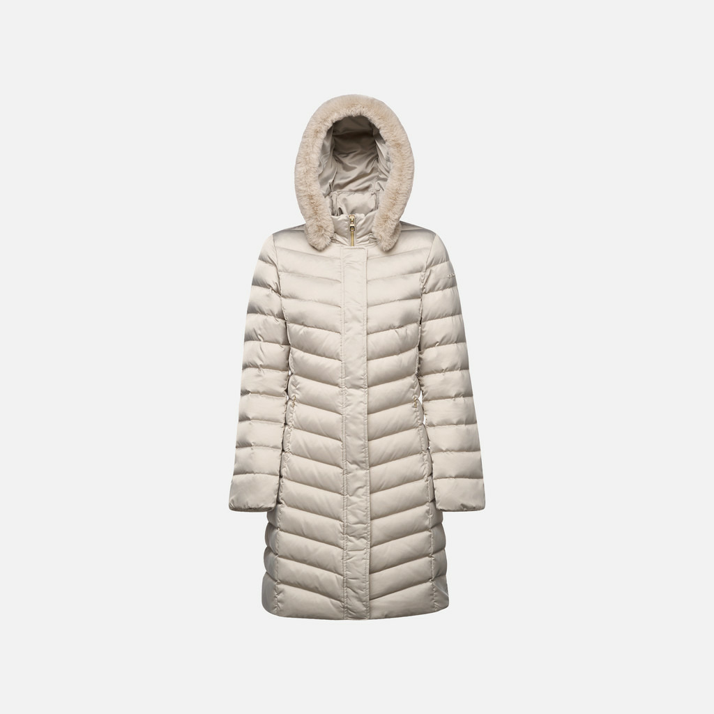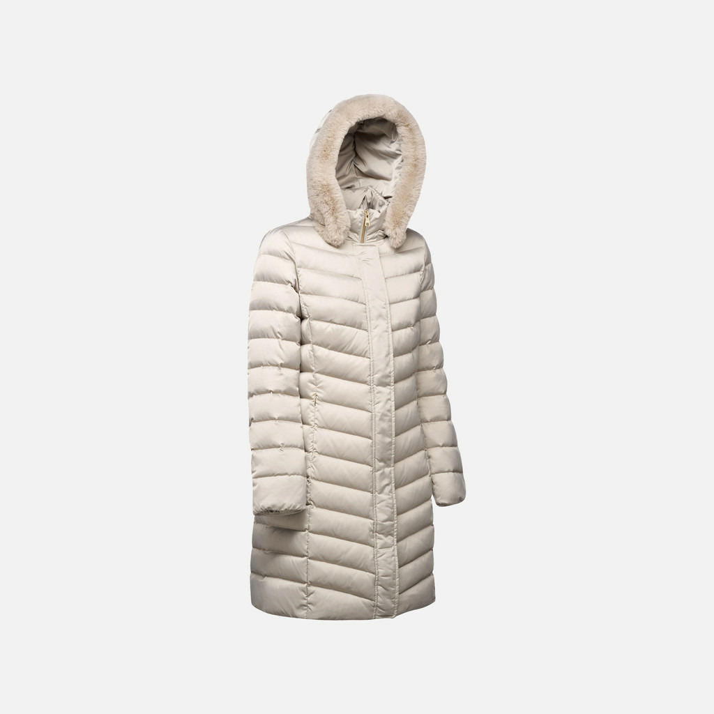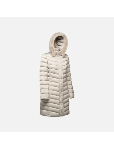 Fabriquée en 100% polyester, elle combine 50% duvet de canard et 50% plumes régénérées pour un garnissage responsable et performant. La capuche amovible avec bordure en fausse fourrure ajoute une protection supplémentaire tout en restant modulable selon vos envies.