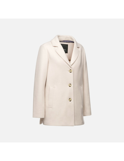 Composition : 70% polyester, 30% laine pour le corps principal, doublure 100% polyester. Capuche amovible en tissu nylon brillant. Coupe 3/4, coupe-vent, coloris blanc lait.