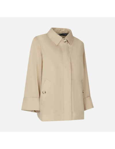 100% polyester, ce caban présente une finition déperlante et coupe-vent. Sa coupe évasée et ses manches kimono assurent un tombé fluide et une grande aisance. Disponible dans une nuance sable subtile, il se distingue par sa légèreté et sa praticité.
