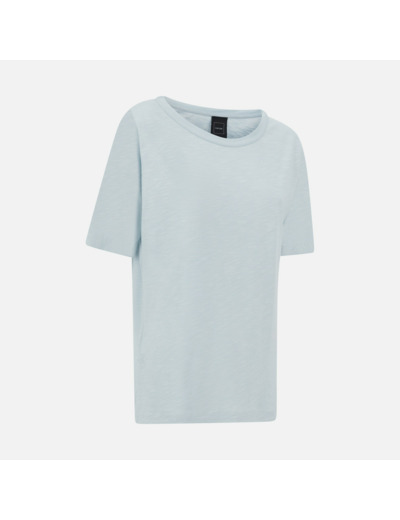 Matière extérieure : 50% coton, 50% modal recyclé. Col bateau, manches courtes, petites fentes latérales. Couleur bleu clair poudre. Tissu léger et respirant, adapté aux saisons chaudes.