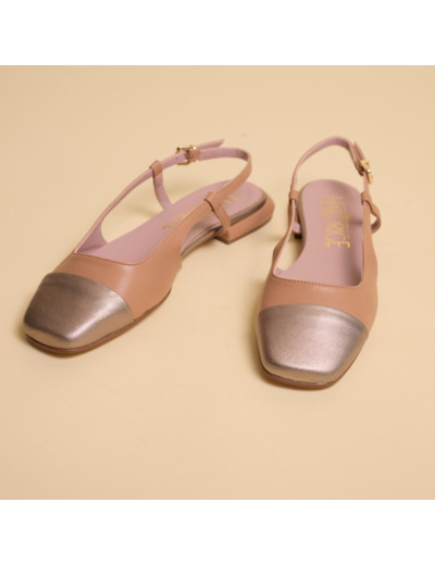 Ballerine bicolore camel avec bout métal, ouverte à l’arrière et dotée d’une bride réglable. Semelle élastomère et son intérieur cuir. Talon 1,5 cm.