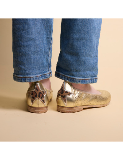 Matière : cuir fantaisie doré. Contour élastiqué pour un maintien précis. Détail étoile léopard au talon. Modèle femme.