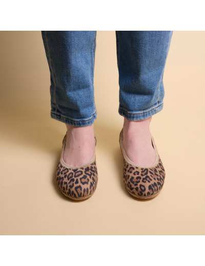 Ballerines femme en cuir fantaisie imprimé léopard, contour élastiqué pour un ajustement sûr, détail étoile léopard au talon. Semelle fine et souple, fermeture sans lacets pour un enfilage rapide.