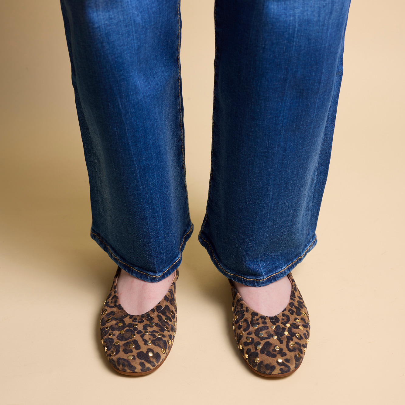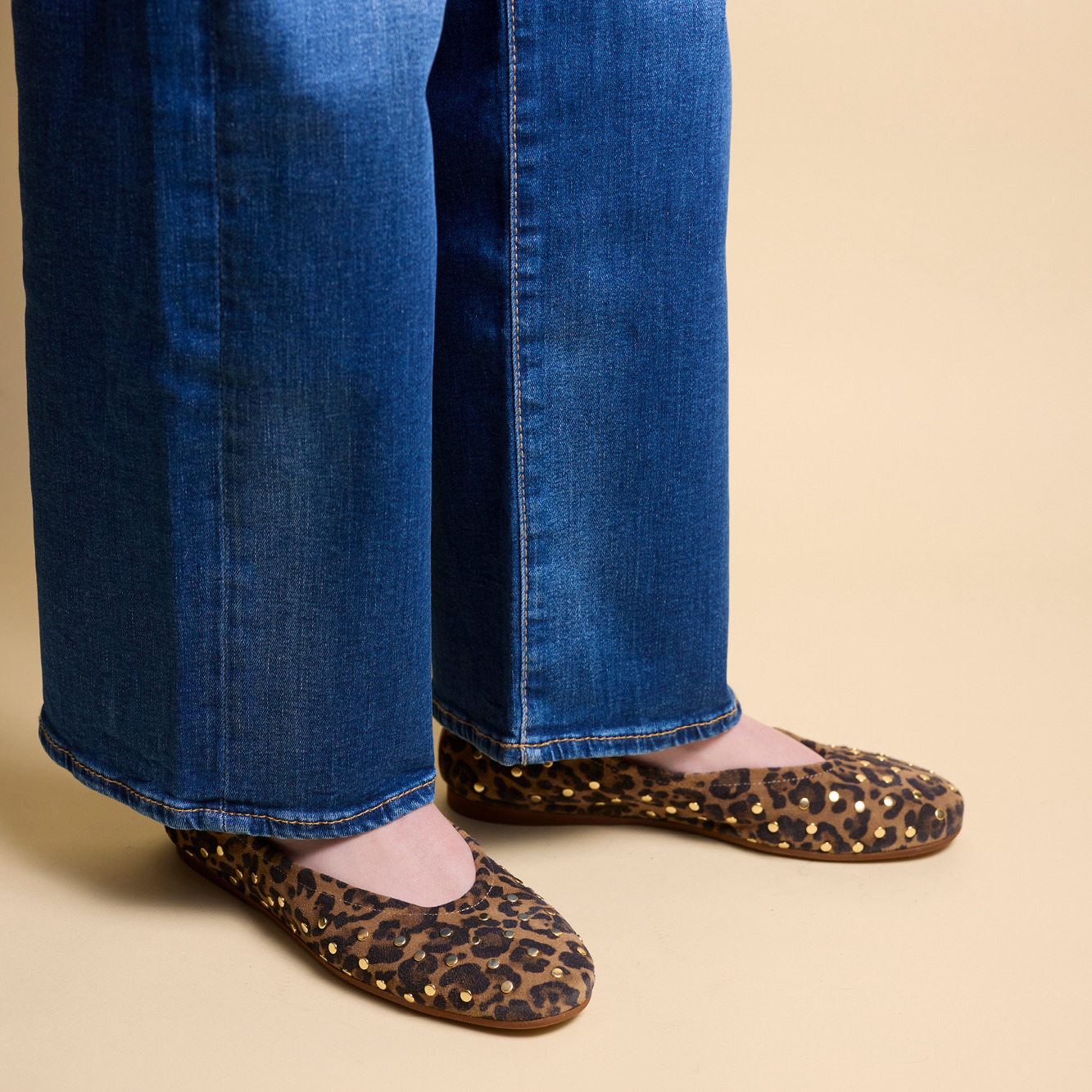 Ballerine léopard avec clous dorés en cuir suédé. Intérieur en cuir pour une meilleure respirabilité. Semelle en élastomère pour un amorti efficace. Élastique autour du pied pour un maintien sûr. Modèle sans talon.