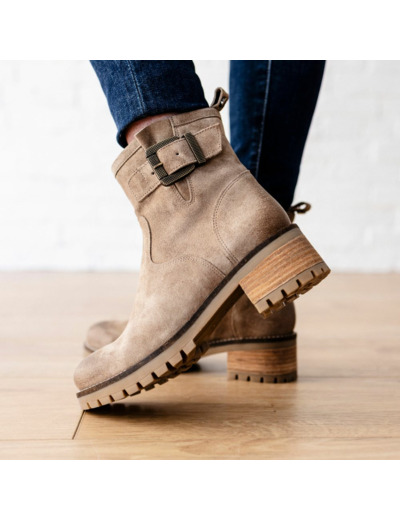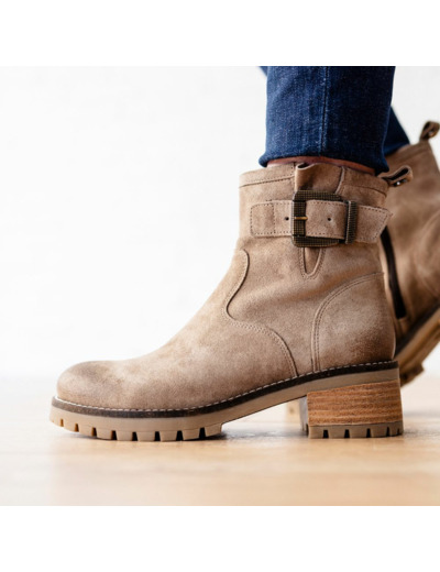 Bottines femme en cuir suédé taupe, boucle dorée. Semelle gomme de 5 cm. Fermeture éclair latérale.