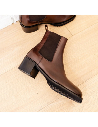 Hauteur de tige : 14 cm. Talon : 5 cm. Semelle : 1,5 cm. Matière : cuir choco. Élastiques latéraux pour un ajustement facile. Semelle en gomme antidérapante.