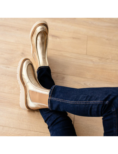 Fabriquées en cuir fantaisie gold, elles disposent d’un élastique sur le côté pour un ajustement parfait. La semelle crêpe garantit une bonne adhérence et un amorti naturel. Le talon mesure 4 cm, idéal pour un port prolongé sans fatigue.