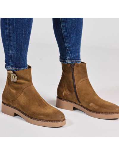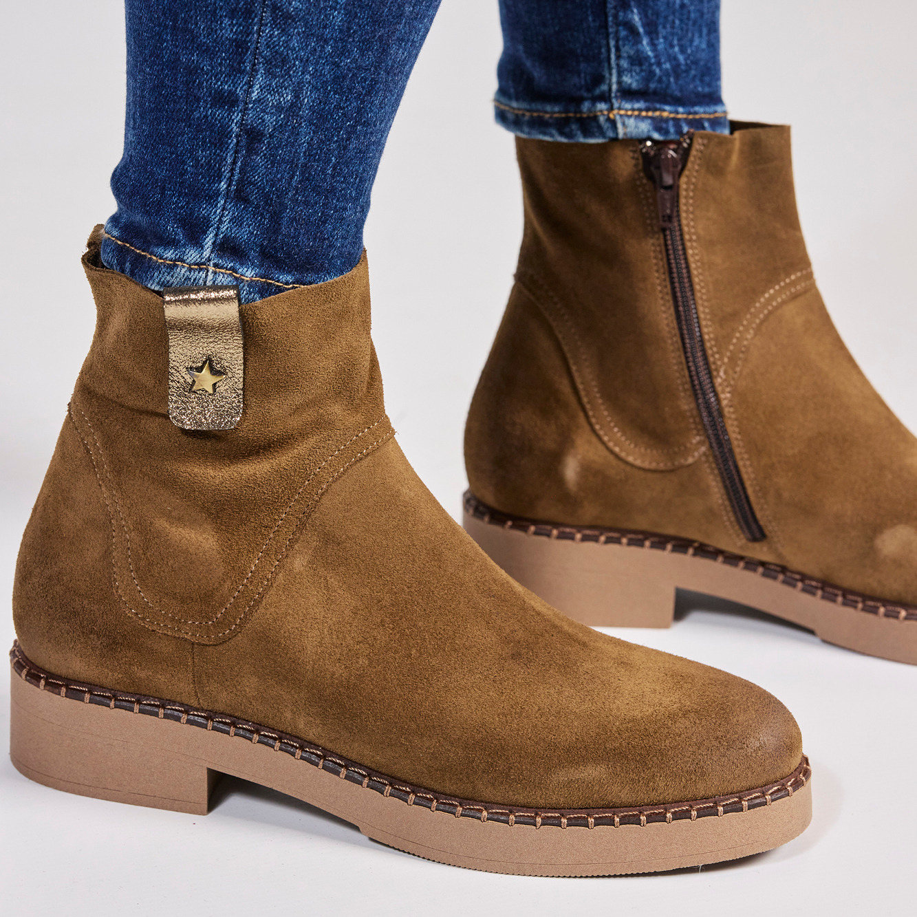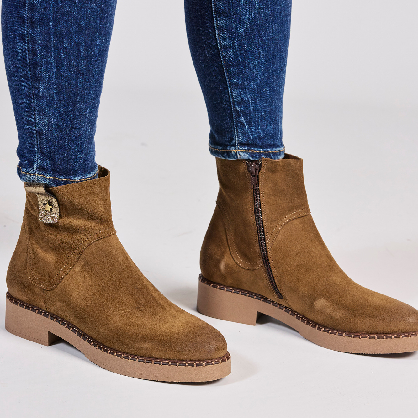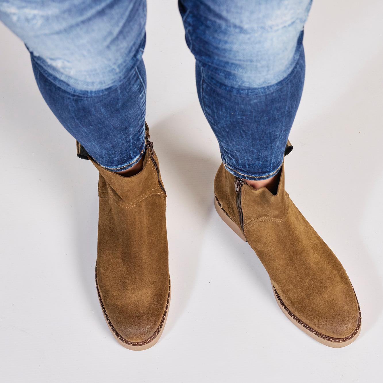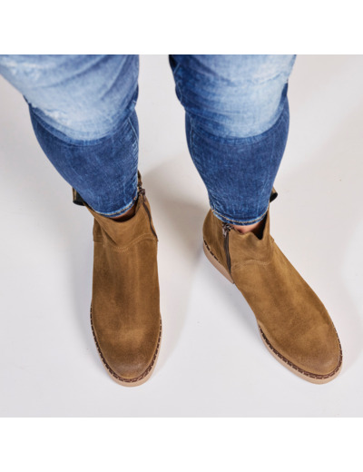 Hauteur de tige : 14 cm. Talon : 4 cm. Semelle en gomme. Fermeture éclair sur le côté. Intérieur en cuir. Cuir fantaisie effet antilope.