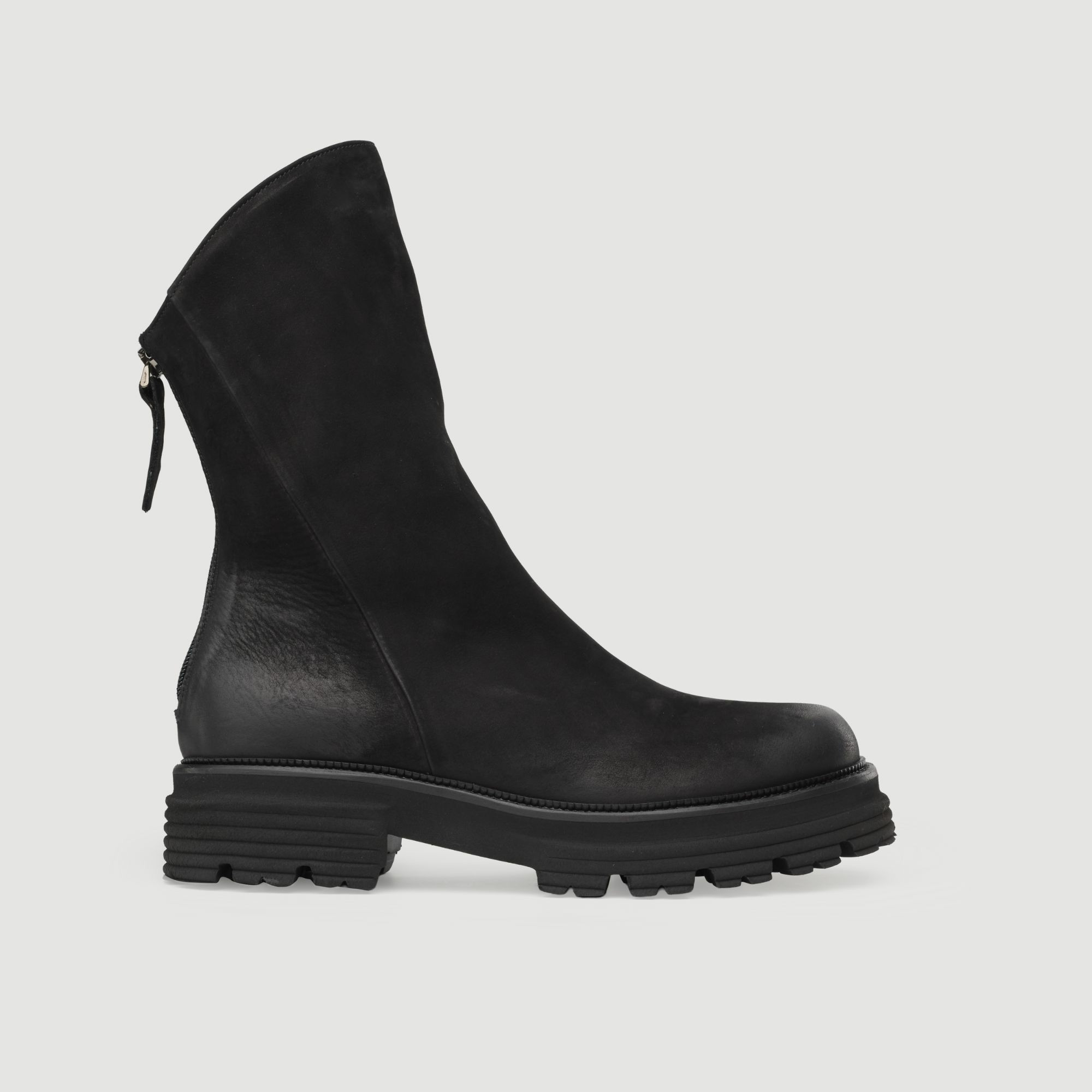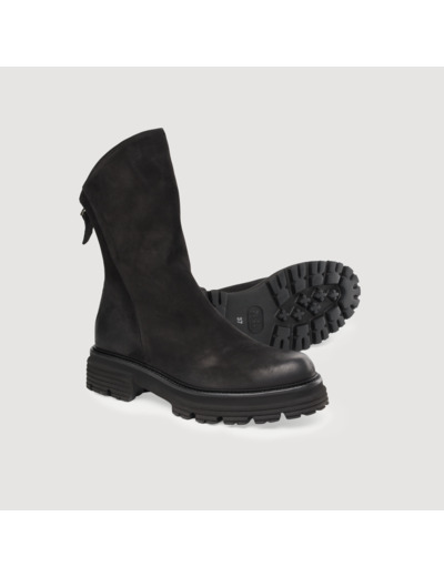 Cuir lisse noir, semelle en élastomère crantée, tige souple, fermeture éclair à l’arrière.