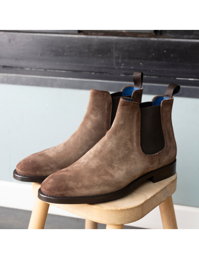 Marque Hardrige, référence 2000013708243. Chelsea boot homme en cuir suédé taupe, cousu blake. Semelle cuir avec patin gomme.