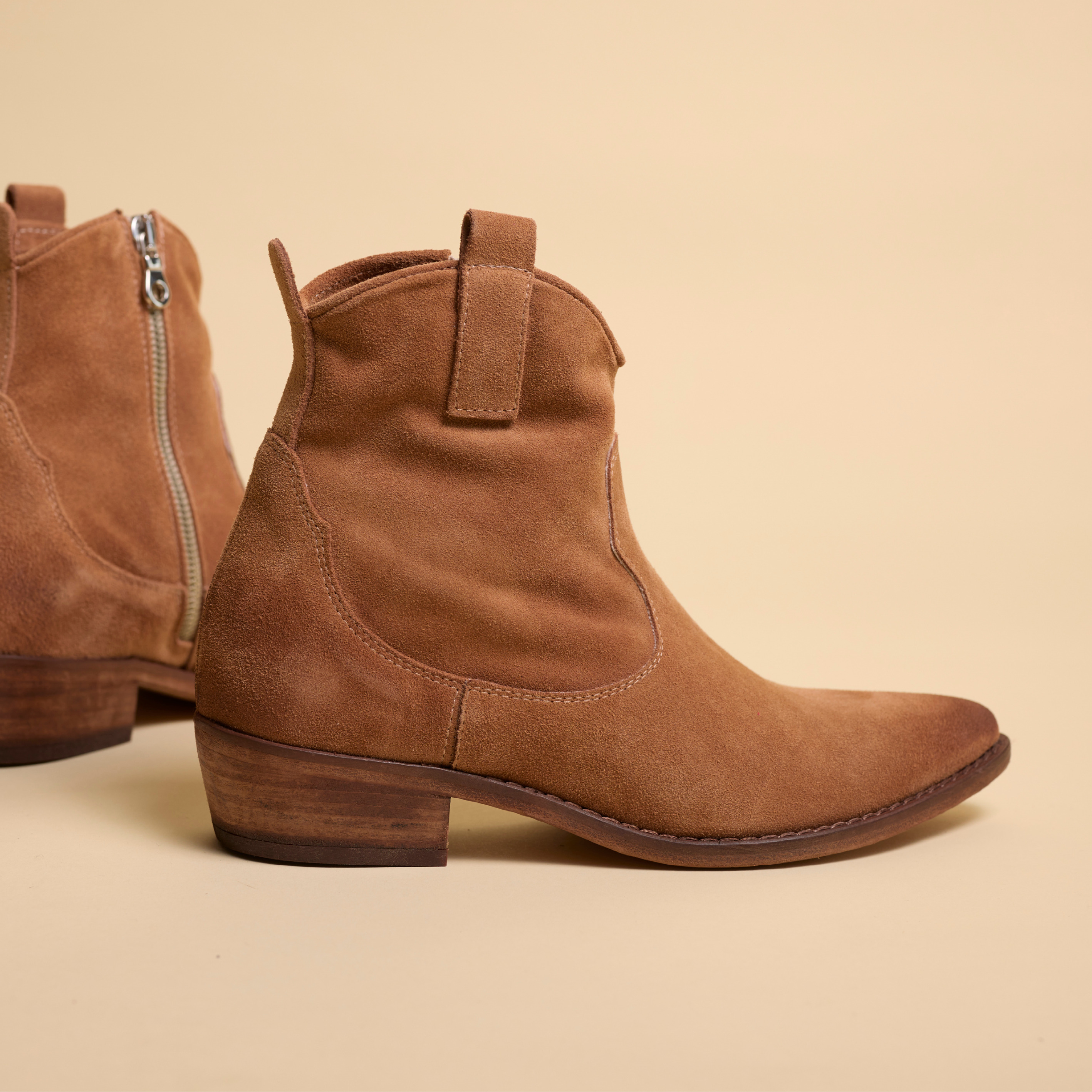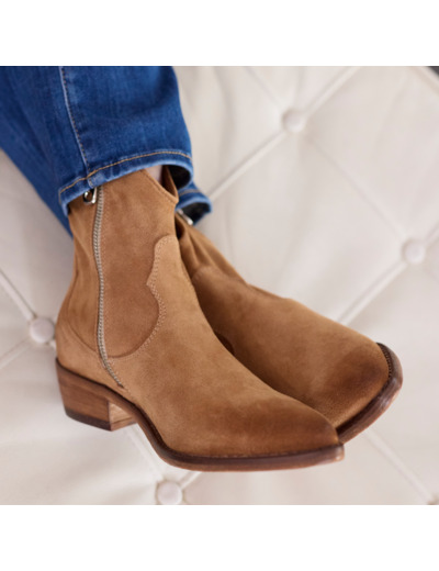 Matière extérieure : cuir suede couleur cuoio. Intérieur et semelle en cuir. Hauteur de talon : 4 cm.