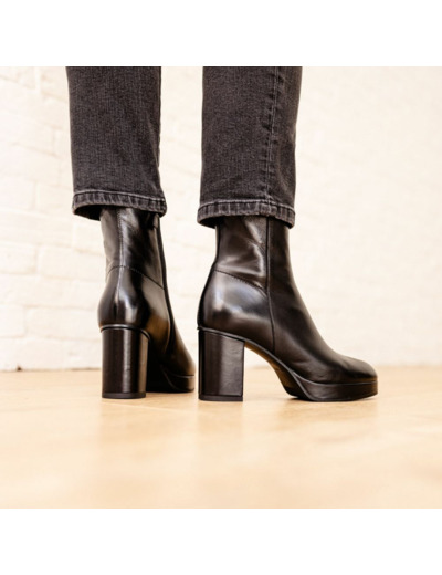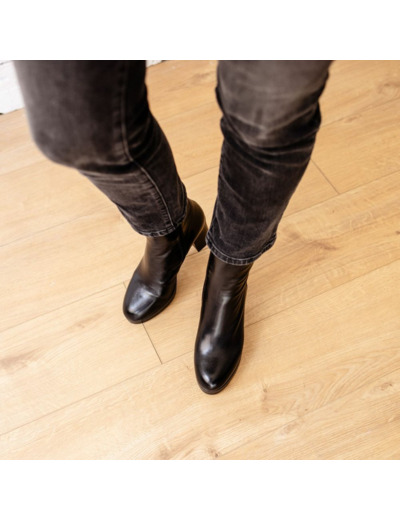 Hauteur de tige : 15,5 cm. Talon : 7,5 cm. Semelle : 1,5 cm. Fermeture par éclair intérieure. Cuir souple noir.
