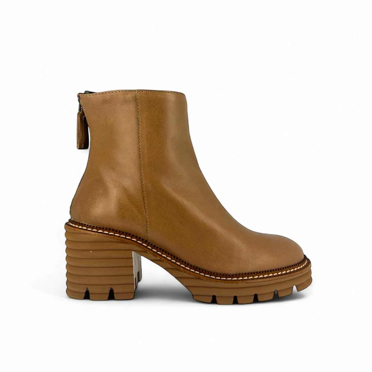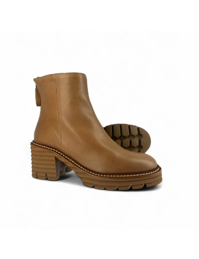 Hauteur de tige : 13 cm. Talon : 6 cm. Semelle : 2 cm. Fermeture : zip arrière. Matière : cuir taupe. Semelle : gomme x-light crantée. Intérieur : cuir.