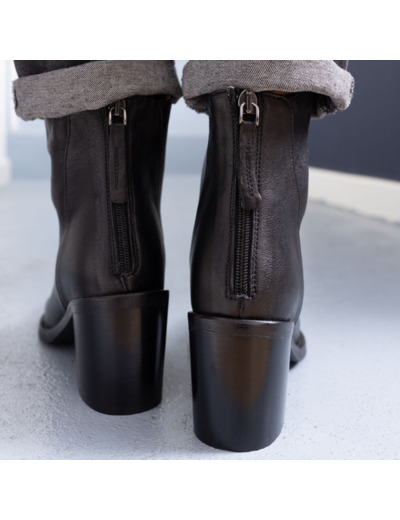 Bottines femme en cuir lisse noir. Fermeture zippée à l’arrière. Talon droit de 7 cm. Semelle extérieure en élastomère. Intérieur entièrement en cuir.