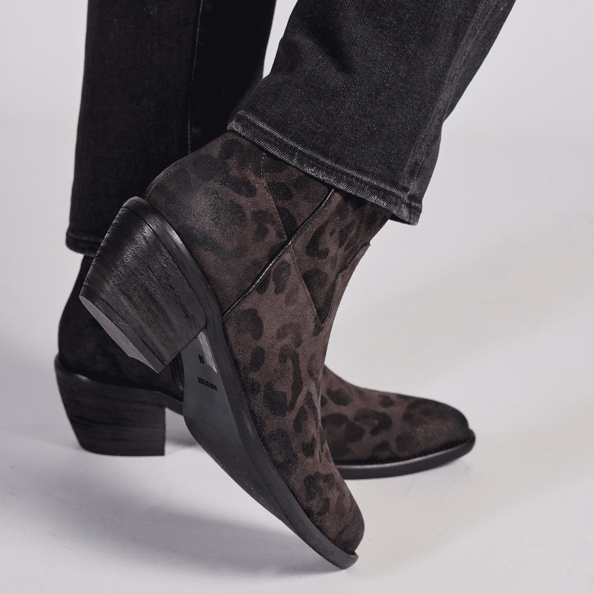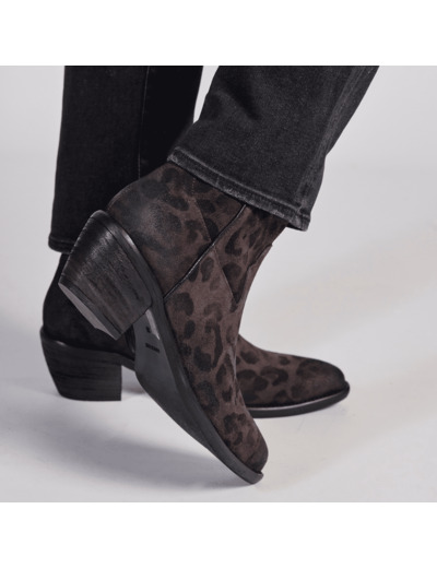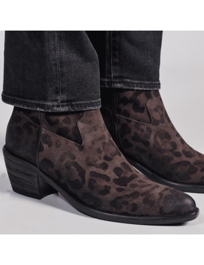 Bottines à talon Santiag, cuir suédé motif léopard foncé, fermeture éclair sur le côté, intérieur en cuir, semelle en élastomère, talon de 5cm.