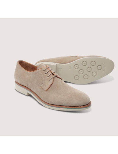 Derby pour Homme en cuir suède Taupe. Semelle gomme X-Light. Montage cousu Goodyear.