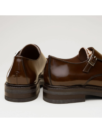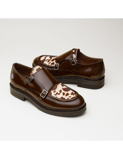 Fabriquée en cuir chocolat, cette derby présente un dessus effet poil façon vachette, une fermeture à double boucle, une semelle en élastomère et une doublure intérieure en cuir.