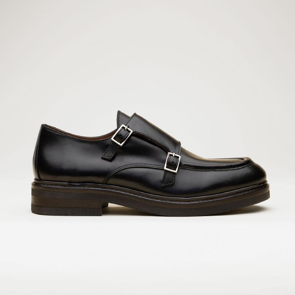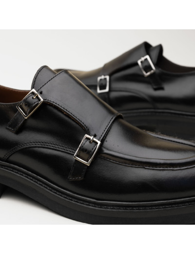 Conçue pour les amateurs de raffinement, cette Derby se distingue par sa fermeture à double boucle, offrant un ajustement précis et une touche d’originalité. Le cuir noir lisse apporte une allure sophistiquée tandis que la semelle en élastomère garantit une adhérence optimale et une résistance durable. Son intérieur en cuir assure un confort naturel, idéal pour une utilisation prolongée.