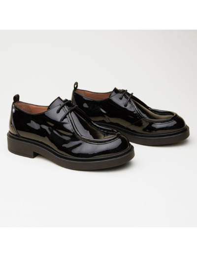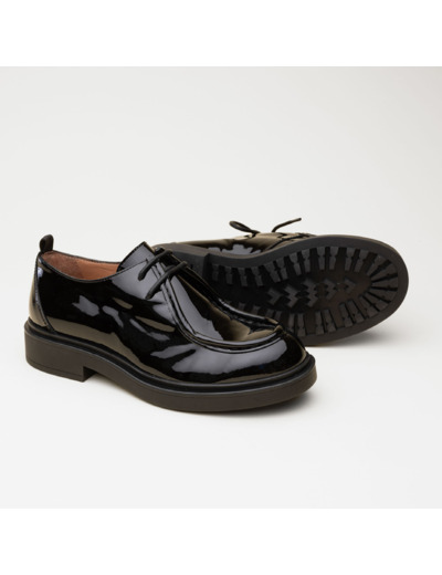 Derby femme en cuir vernis noir, intérieur cuir, antiglissoire, lacet en cuir. Semelle crêpe. Talon 4,5 cm.