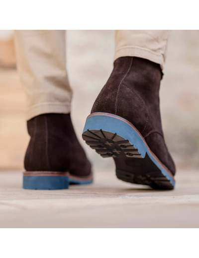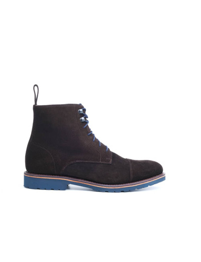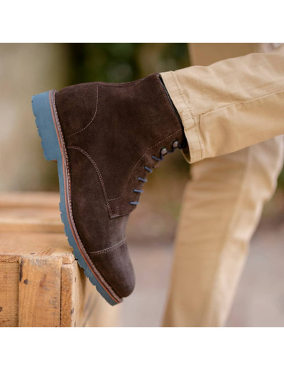 Boots à lacets pour homme en Cuir velours marron  et semelle gomme. Montage Cousu Goodyear.