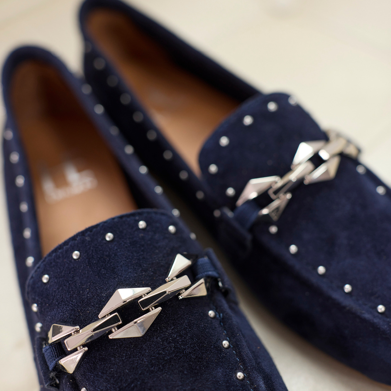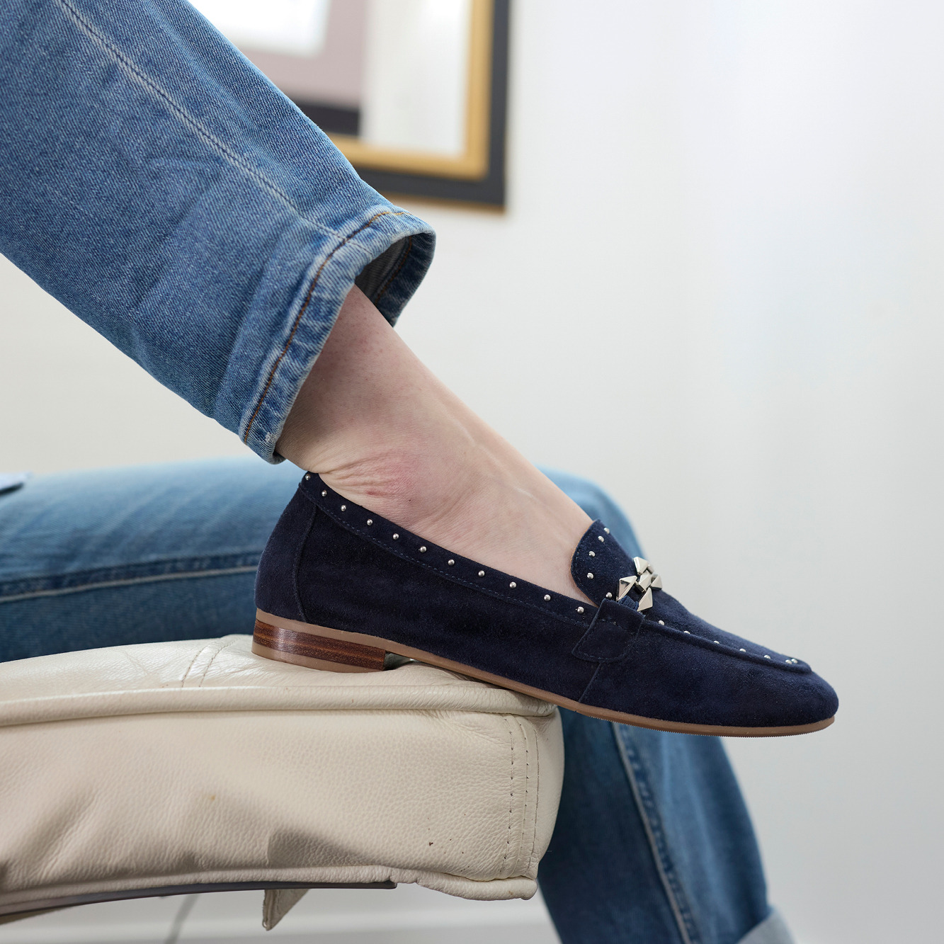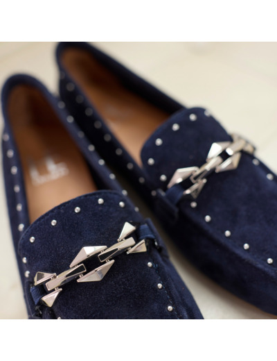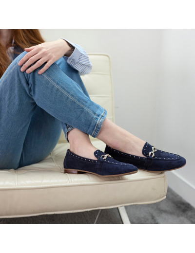 Mocassin femme en cuir suédé marine, forme allongée, orné d’un petit clou doré et d’un morsetti doré sur le dessus. Semelle extérieure en gomme, intérieur 100 % cuir. Talon de 2 cm.