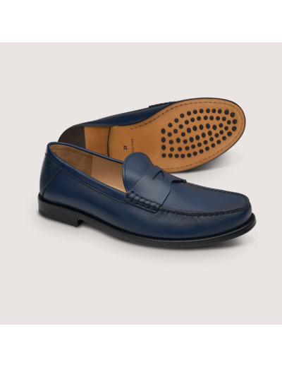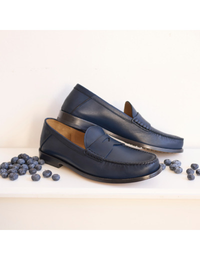 Mocassin Mae, Cuir lisse bleu, Montage cousu mocassin, Semelle cuir & patin gomme.