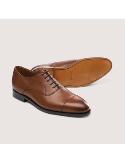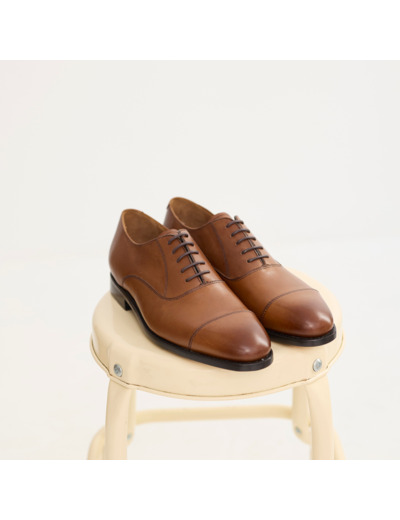Cuir veau patiné coloris gold. Montage cousu Goodyear. Semelle en cuir. Référence produit : 2000013472229.