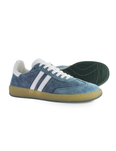 Sneakers pour homme Gazel Bleu Ciel, cuir suédé, cousu Bolognais, doublure intérieure cuir et éponge, semelle gomme marron, deux bandes sur le côté extérieur.