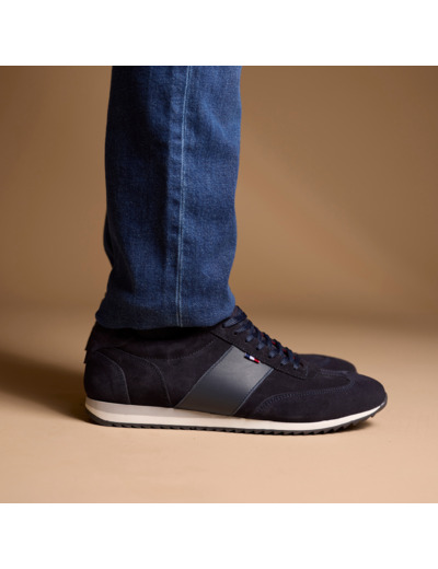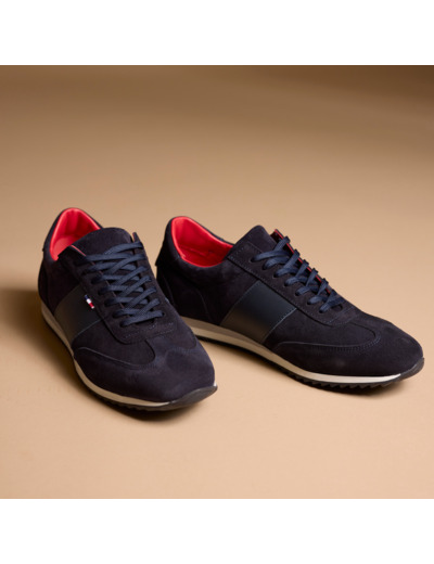 Affirmez votre style avec cette basket en cuir suédé marine, alliant élégance et modernité. Une silhouette sobre rehaussée par un intérieur rouge audacieux pour un look unique.