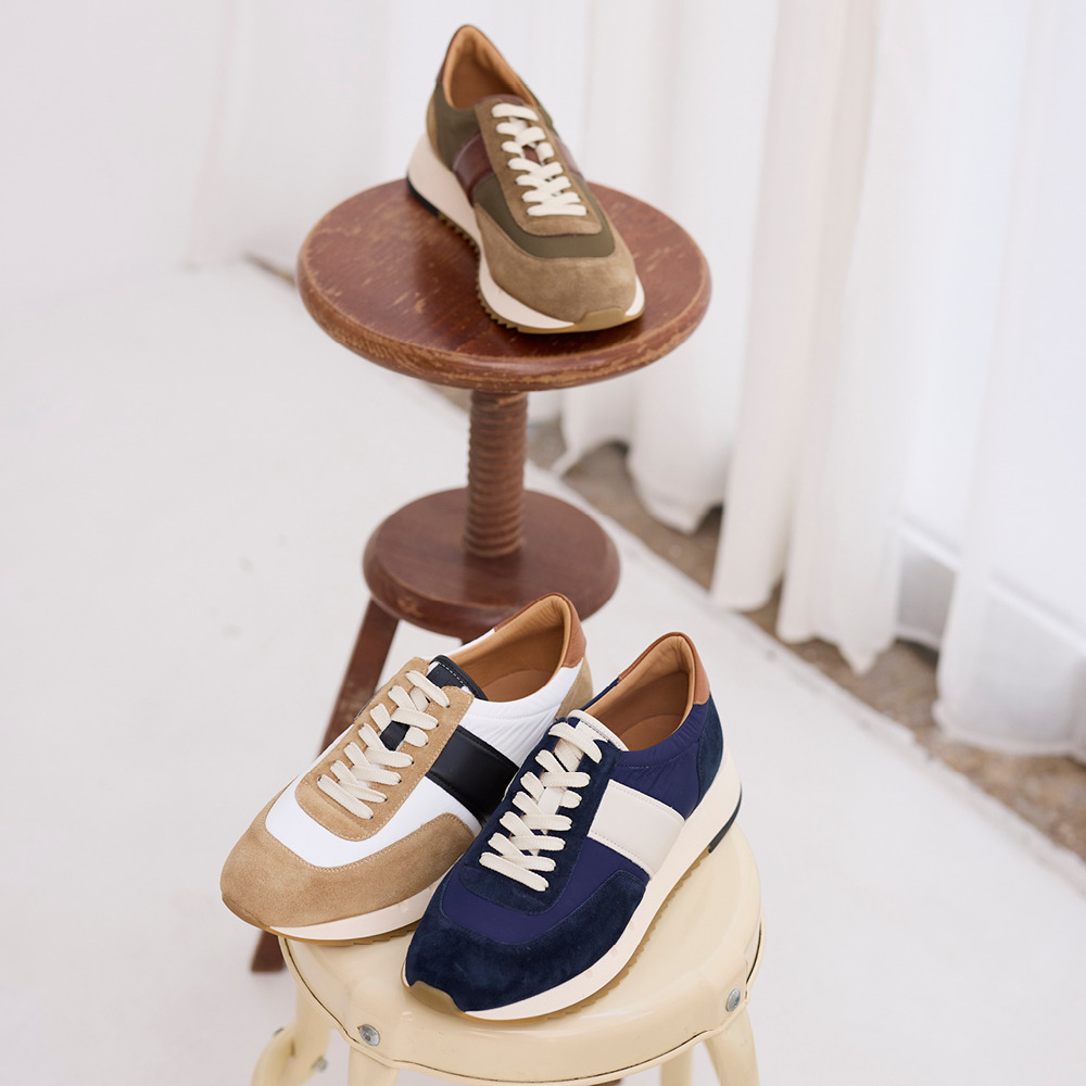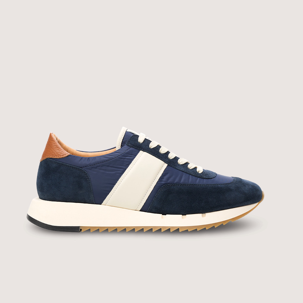 Sneakers pour homme Navy et Blanc. Bi-matière toile Nylon et cuir. Montage soudé. Doublure intérieure cuir. Semelle gomme crantée Blanche.