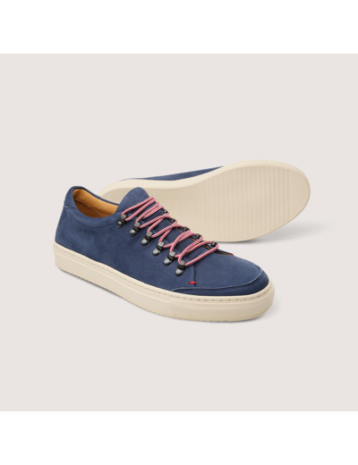 Sneaker Homme en cuir nubuck bleu, Semelle gomme, Montage cousu bolognais.